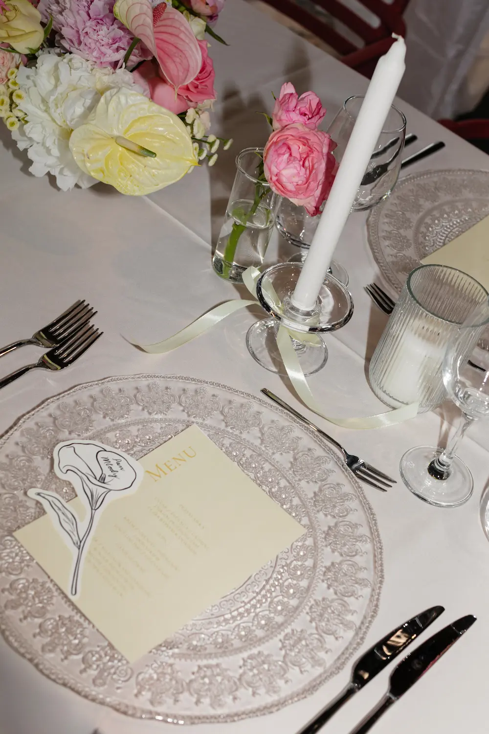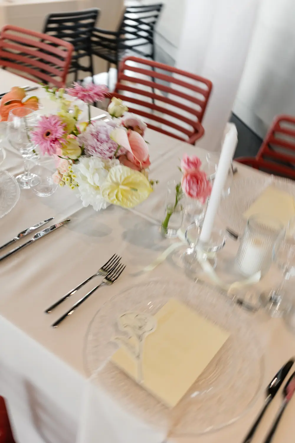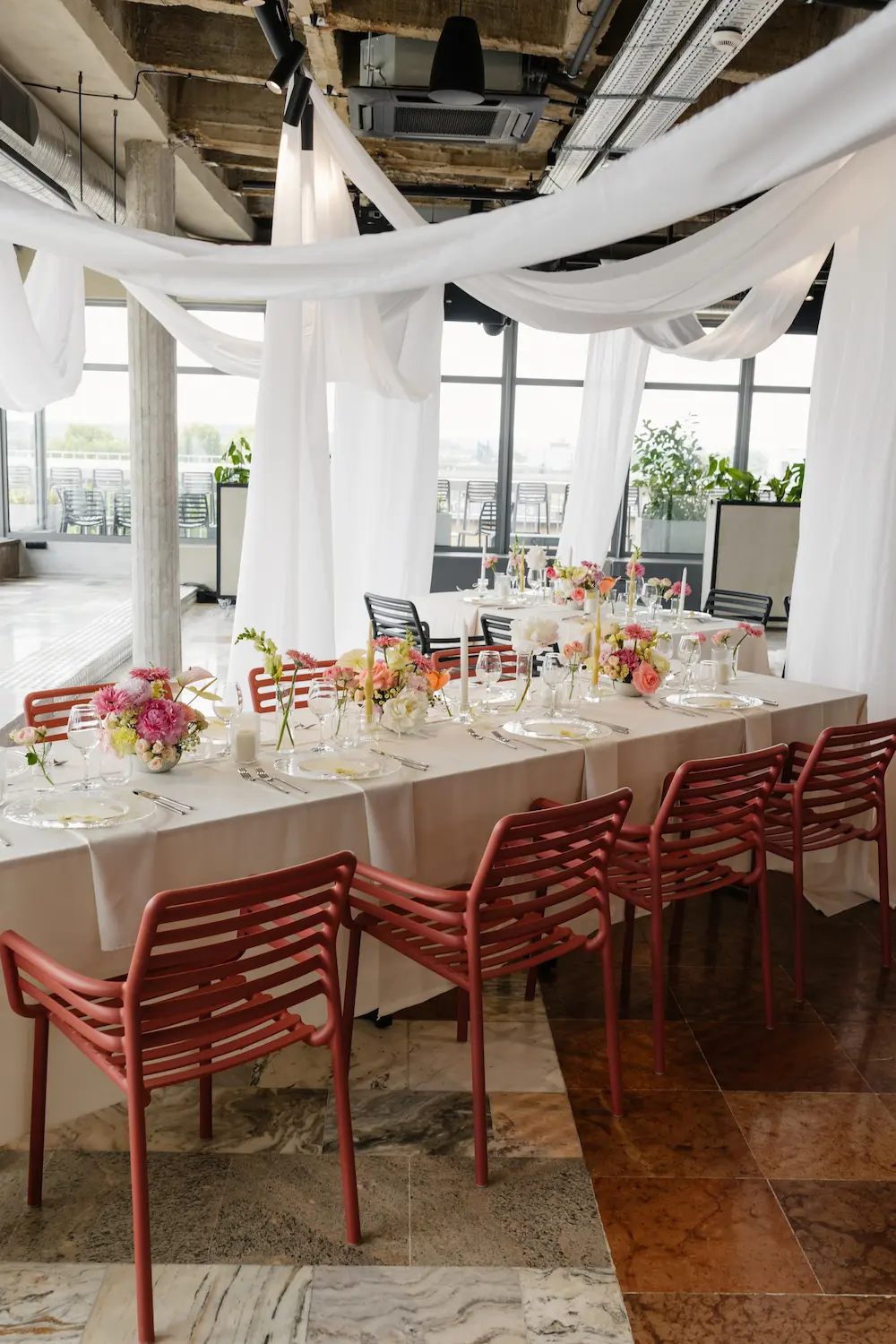 - Dekoracje: przeważały delikatne, pastelowe akcenty – butter yellow i różowy, z subtelnymi podwieszanymi dekoracjami i tkaninami wiszącymi nad stołami.
