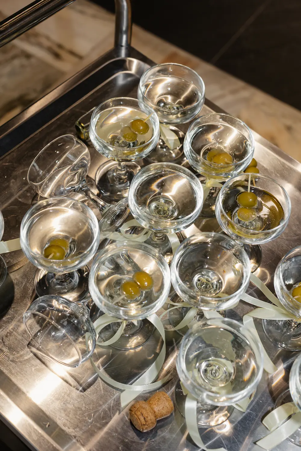 - Stoły: prostokątne ustawione w układzie gwiazdy, co tworzyło intymne grupy rozmów i efektowną, wizualnie „gwiazdową” kompozycję.