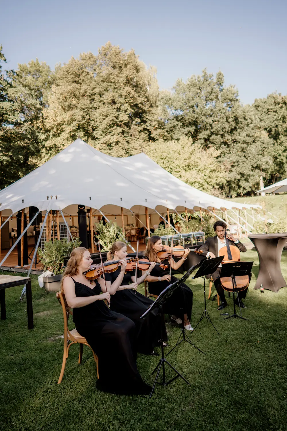 - Wesele i aperitif: godzinny aperitif z udziałem kwartetu muzycznego, któremu towarzyszyły subtelne brzmienia na świeżym powietrzu. Barman poza namiotem radził sobie doskonale z obsługą gości i smakami drinków.