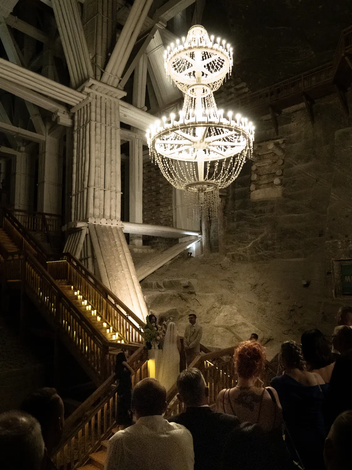 - Kopalnia Soli Wieliczka: niezwykły klimat podziemi — ślub odbył się w wyjątkowym miejscu, a zjazd do podziemi stanowił atrakcję zarówno dla polskich, jak i zagranicznych gości.