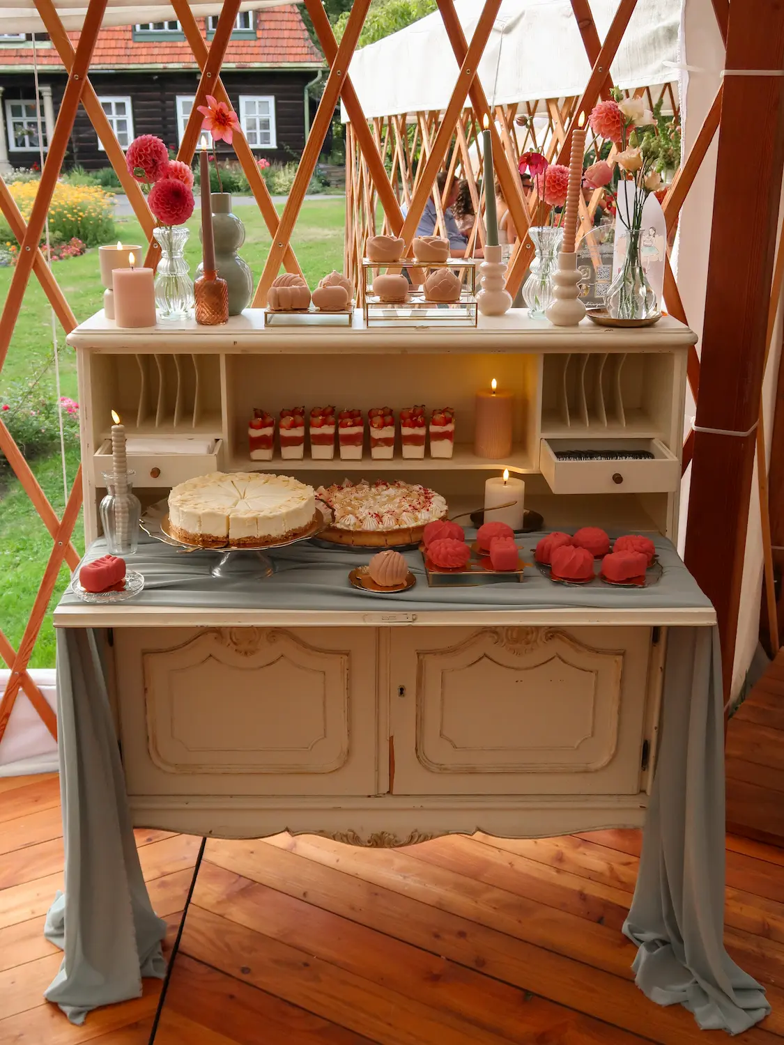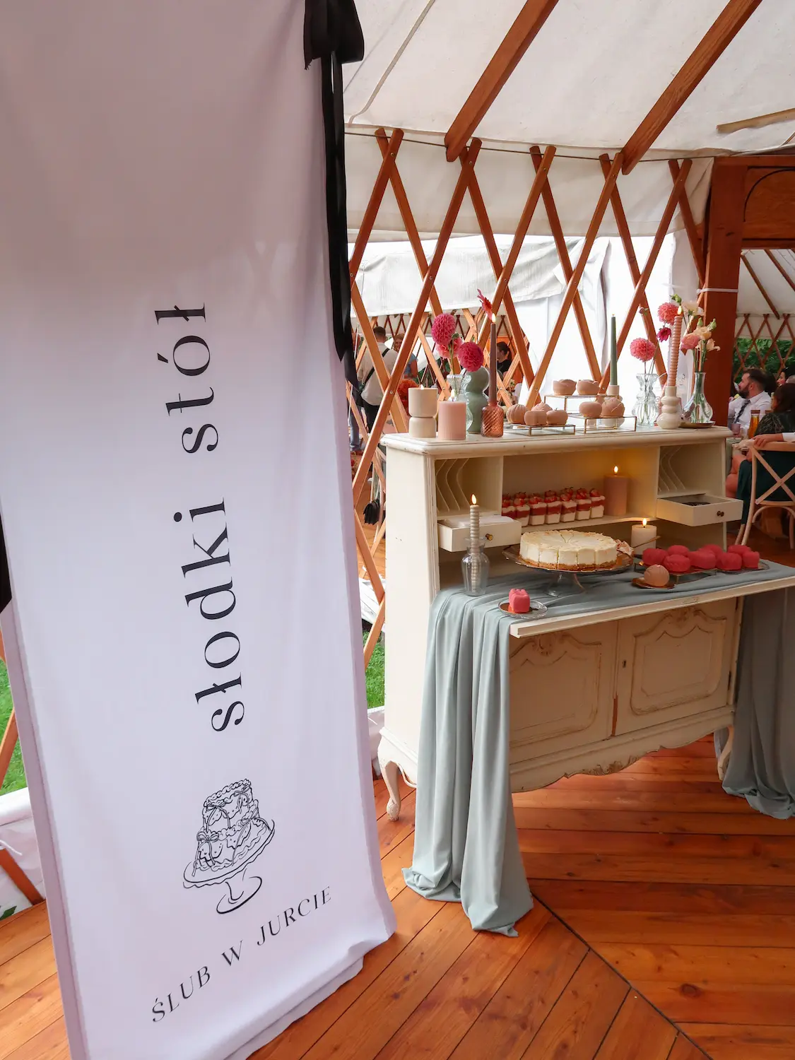 - Słodkości i tort: Dwie do smaku z różnorodnymi słodkościami i tortem , dopasowane do preferencji pary i gości.