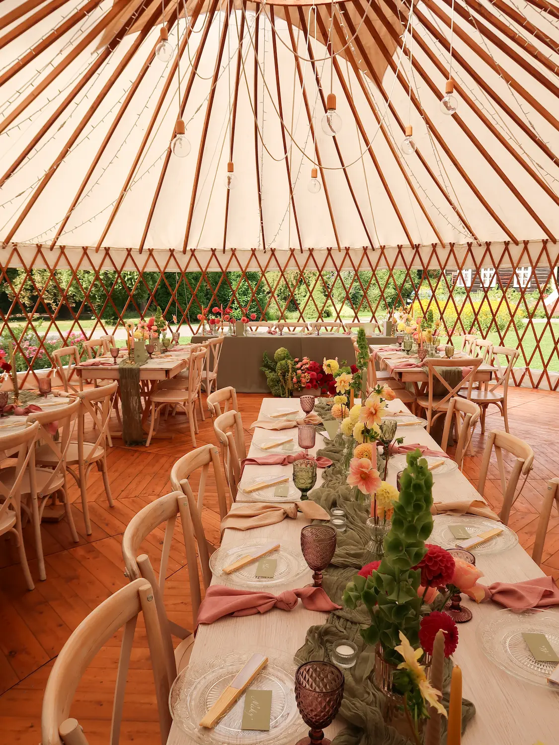 - Lokal Ślub w Jurtach by bemywife w Zręczycach: wesele w jurtach przyniosło luźną, a zarazem elegancką atmosferę, która sprzyjała swobodzie i dobremu humorowi gości.