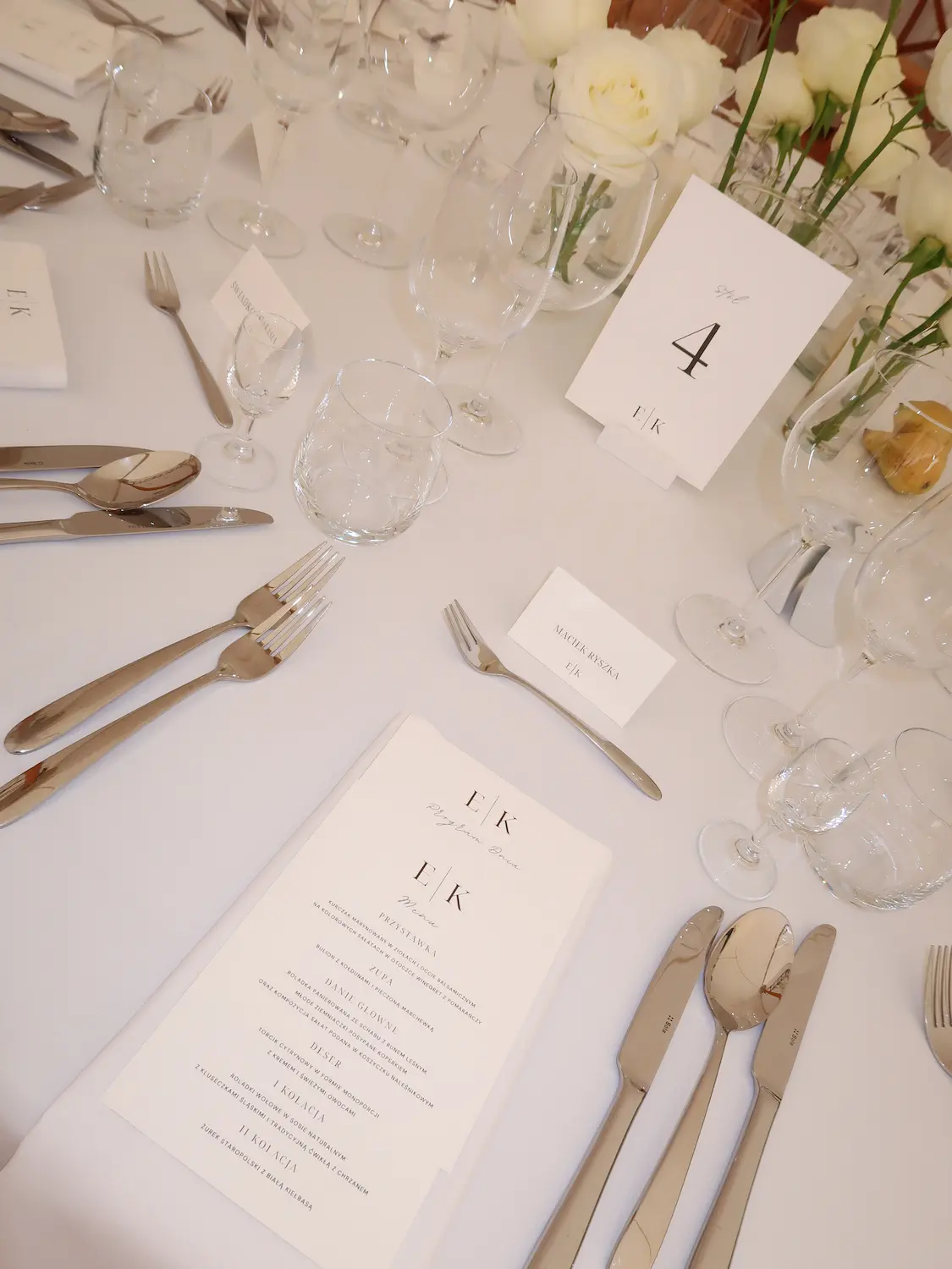 • Dekoracje i papeteria: para osobiście zadbała o dekoracje i papeterię; wnętrza i detale w bieli, które tworzyły spójny, luksusowy klimat.